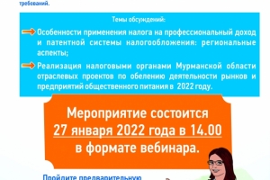 Управление Федеральной налоговой службы по Мурманской области приглашает принять участие в публичном обсуждении результатов правоприменительной практики налоговых органов, руководств по соблюдению обязательных требований на тему: «Особенности применения налога на профессиональный доход и патентной системы налогообложения. Реализация налоговыми органами Мурманской области отраслевых проектов по обелению деятельности рынков и предприятий общественного питания в 2022 году».